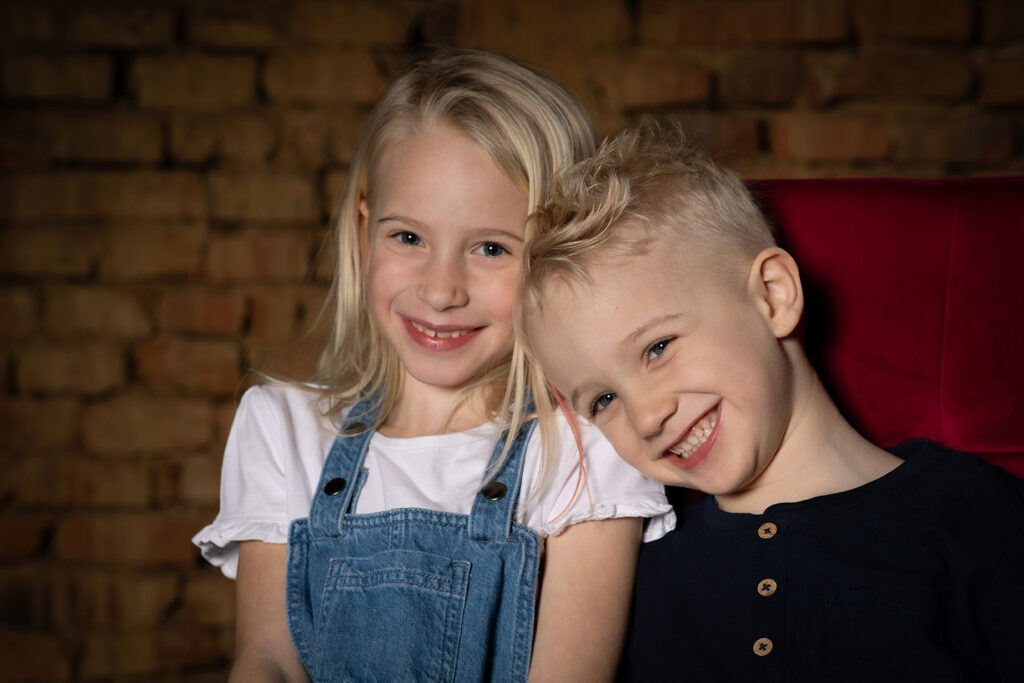 mädchen kniet am boden und lächelt den bruder an der im schneidersitz daneben sitzt und strahlt vor einer alten Selch am DachbodenFotostudio
